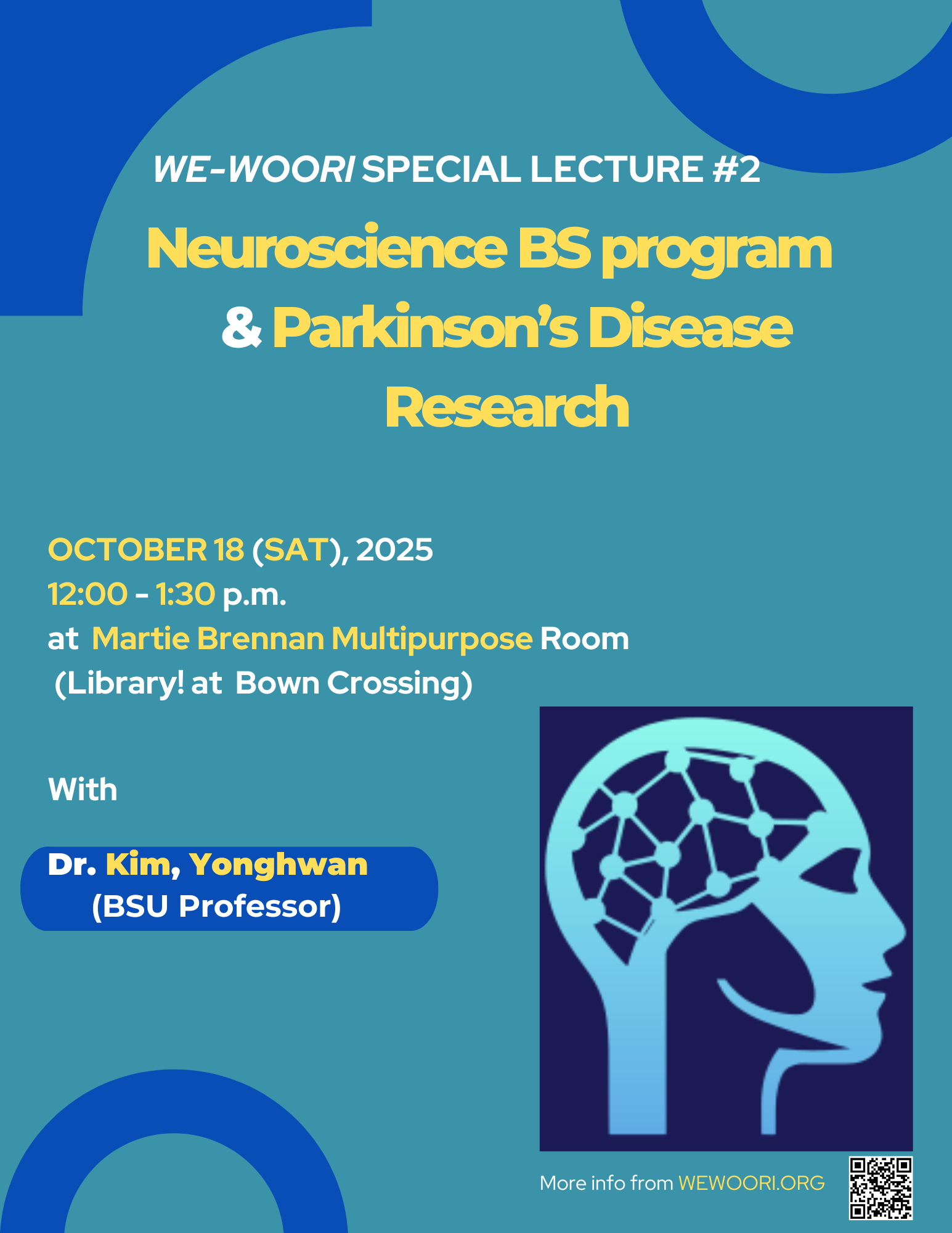 On Saturday, Oct. 18, We-Woori will host the second lecture in our special series, featuring Dr. Kim, Yonghwan (BSU professor). He will present on neuroscience and Parkinson’s disease, with a special focus on what our youth can expect to study in neuroscience at the college level.